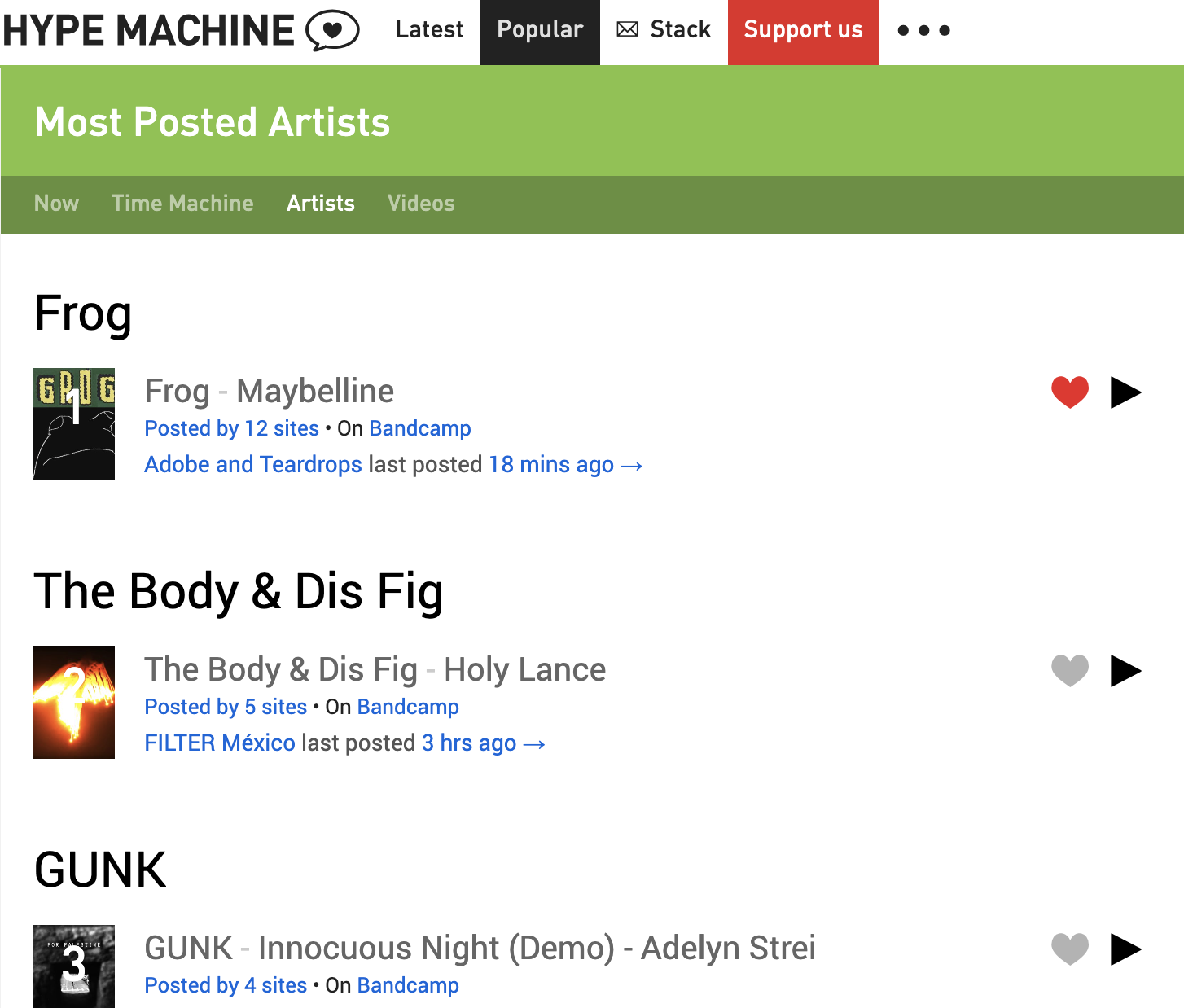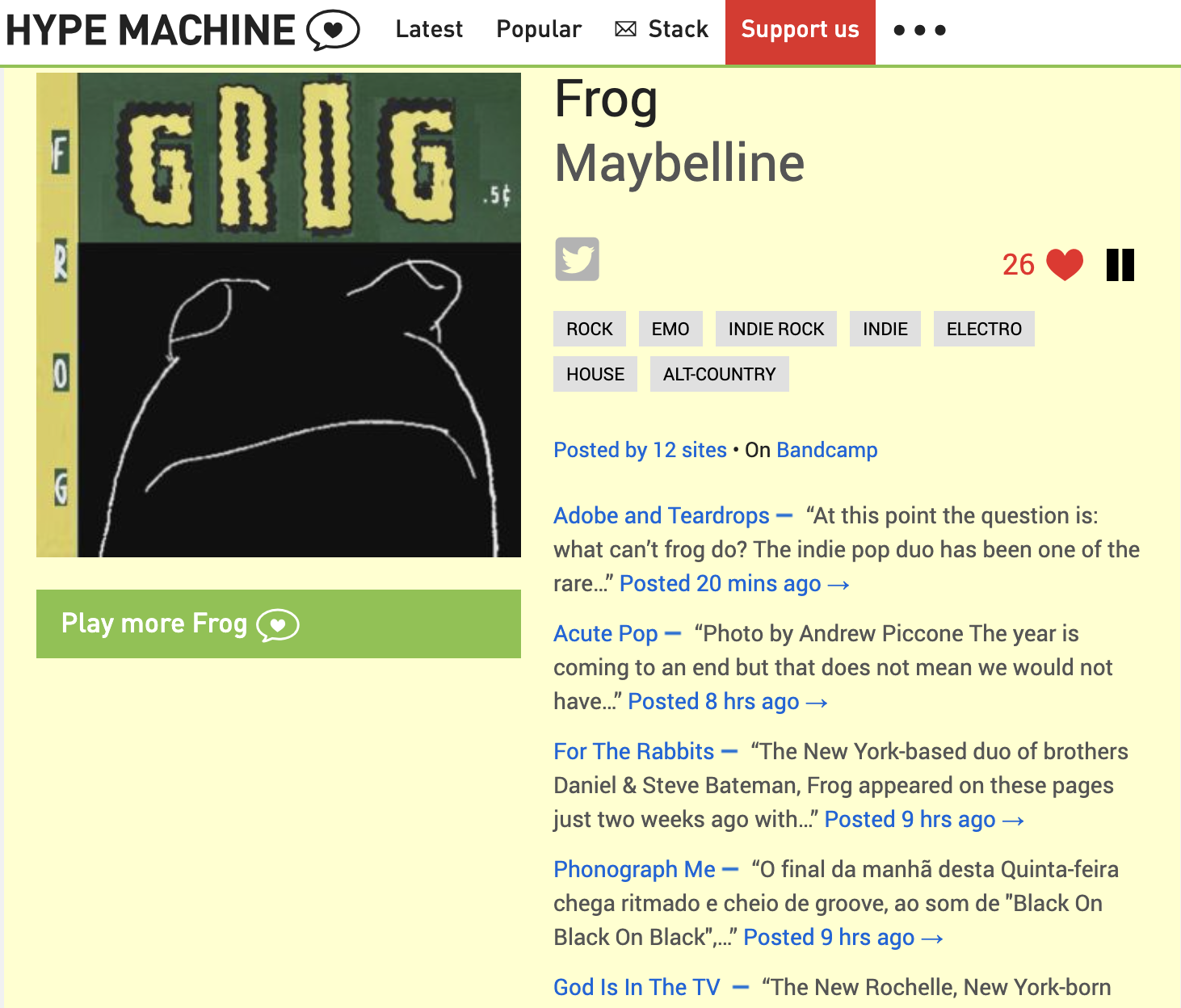 Our thanks to Acute Pop (Italy), Adobe & Teardrops (USA), For The Rabbits (England), God Is In the TV (Wales), HI54 Blog (Canada), START-TRACK (Slovakia) and Various Small Flames (England) for all their hard work and for helping Frog become the “#1 Most Posted Artist“ on Hype Machine!