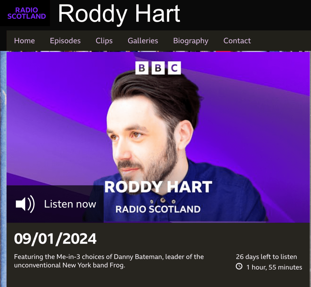 Tonight (Jan 9th): Bateman will also be on BBC Scotland tonight for The Roddy Hart Show. With ‘GROG’ having recently been the show’s “Record of Note,” Bateman was invited to talk about three songs that shaped him for their “Me-in-3” feature. Listen live at 10pm GMT / 5pm EST or catch it after broadcast on BBC Sounds. Thanks to Roddy and Richard Bull for arranging this.