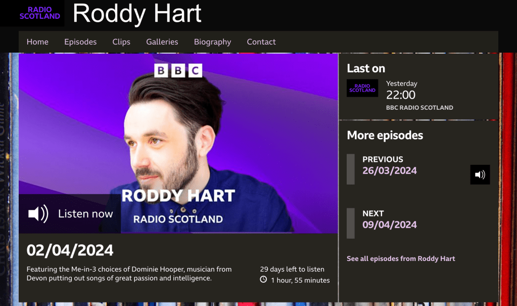 Magana’s Teeth was the “Record of Note” on BBC Scotland’s Roddy Hart show last night. Roddy played three songs from the album and said a lot of lovely things about it. If you missed it live, you can listen to it via BBC Sounds.
