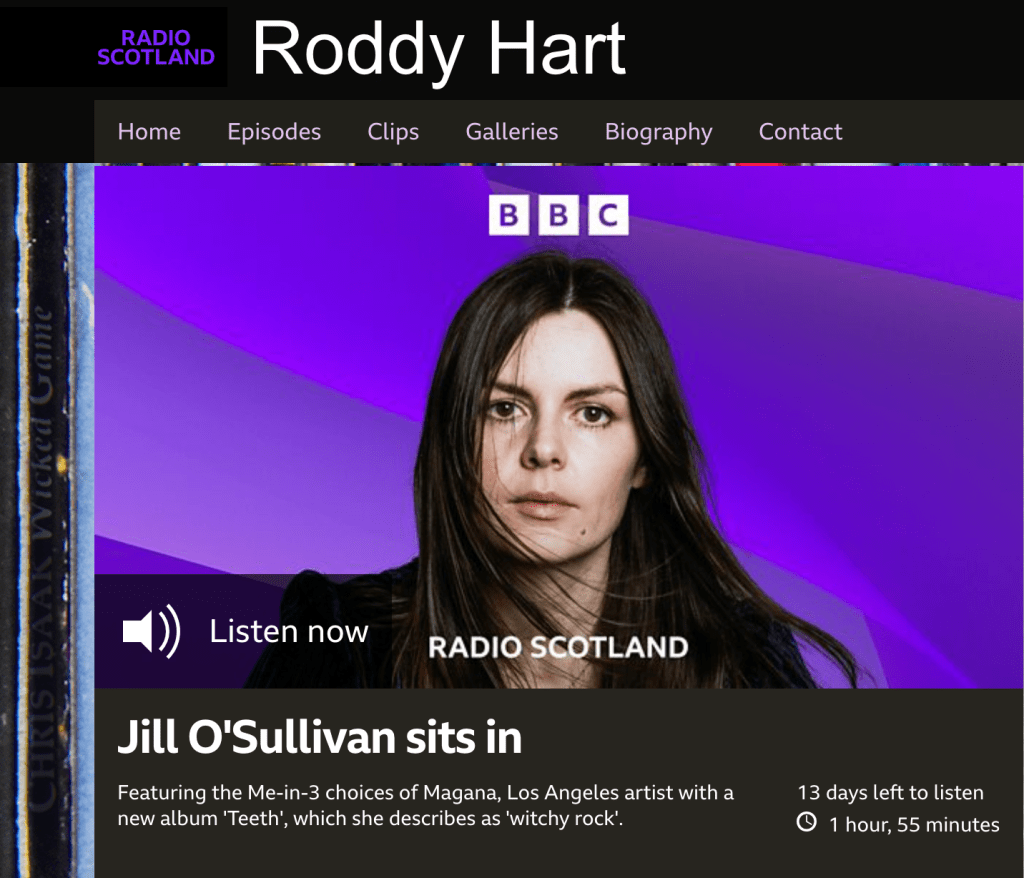 She was also recently the “Me In 3” guest on BBC RADIO SCOTLAND with Jill O’Sullivan (thanks to Roddy Hart and Richard Bull):