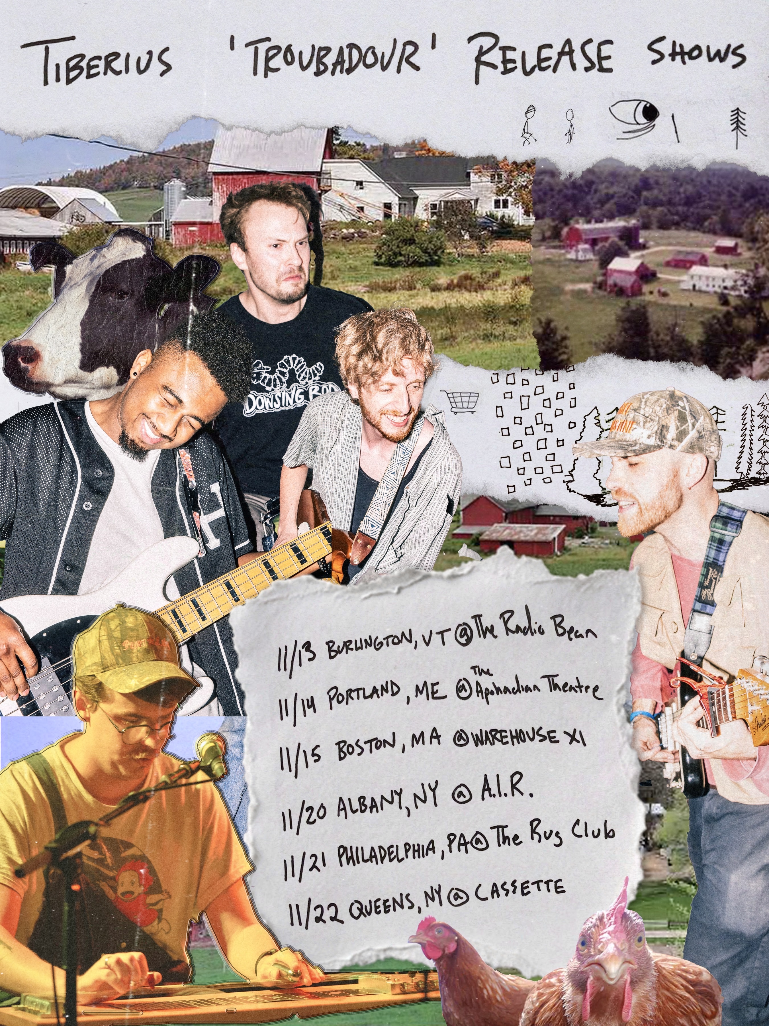 Tiberius Live: Nov 13th @ Radio Bean, Burlington, VT / Nov 14th @ The Apohadion Theater, Portland, ME (W/ Dead Gowns & Bagcatcher) / Nov 15th – Warehouse XI, Boston, MA (Album launch W/ Winkler) / Nov 20th – A.I.R., Albany, NY / Nov 21st – The Rug Club, Philadelphia, NY / Nov 22nd – Cassette, Queens, NY (W/ Paper Lady & Dolly)