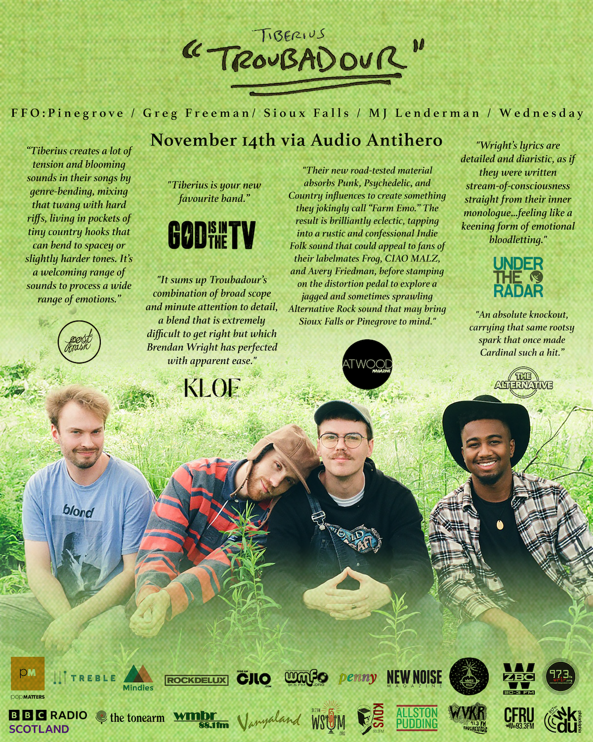 “It’s been a big year for Boston indie rockers Tiberius. A couple cross-country tours have taken them as far as Texas while they’ve also found the time to play on what feels like every great band in town’s record release party all while readying their own fifth LP (and very first on hotly-tipped label Audio Antihero) entitled Troubadour. A massive leap for an already well-established group, the record finds fronter Brendan Wright writing vividly about their travels across this big nation, the allure of music scenes beyond our fine city, and the backbreaking work that is schlepping heavy ass gear from basement to basement among other topics. Moving from blistering college rock guitar manglers to pretty, steel-accented Americana (sometimes within the same song), Tiberius have truly made one of the year’s greatest sounding rock records coming outta anywhere.” – ALLSTON PUDDING